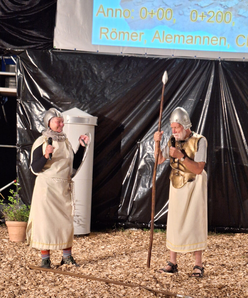 Die Idee dazu, sowie Drehbuch, Regie und Moderation lag in der Verantwortung von Hubert Mauz. Er hat für unser Wolterdingen etwas Außergewöhnliches geschaffen. Die Spielfreude der vielen Wolterdinger Akteure bleibt in dankbarer Erinnerung: Gleich zu Beginn die temperamentvollen und schlitzohrigen Italiener, Peter Welte und Markus Schrenk, entdeckten – ohne es zu wissen – eine Sensation, nämlich die aus der Keltenzeit stammenden wertvollen Doppelspitzbarren. Auch der Schmied (Hannes Heizelmann) erkannte das Alter der Barren nicht. Die beiden Italiener behielten gleich ein paar für sich und gaben nicht alle ihrem Chef alias Michael Doser. Gäste aus Bräunlingen, nämlich Ursula Gehringer und Eckard Zundel, stellten die Lebenswelt zur Römer- und Allemannenzeit  dar und waren von echten Römern kaum zu unterscheiden. Dass es bei der „Geburtsstunde Wolterdingens“ im Kloster Sankt Gallen nicht immer ernst und „nüchtern“ zuging, zeigte der Ortschaftsrat unter der Leitung von Armin Maier. „Fischer“ Martin Weninger, verkaufte, unbeeindruckt von der Obrigkeit, sowohl Fische als auch Biber an die Geistlichkeit, denn „in der Fastenzeit sind die Biber ja auch Fische“. Sie schwimmen im Wasser…