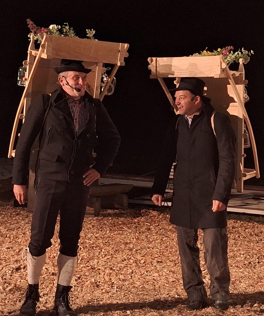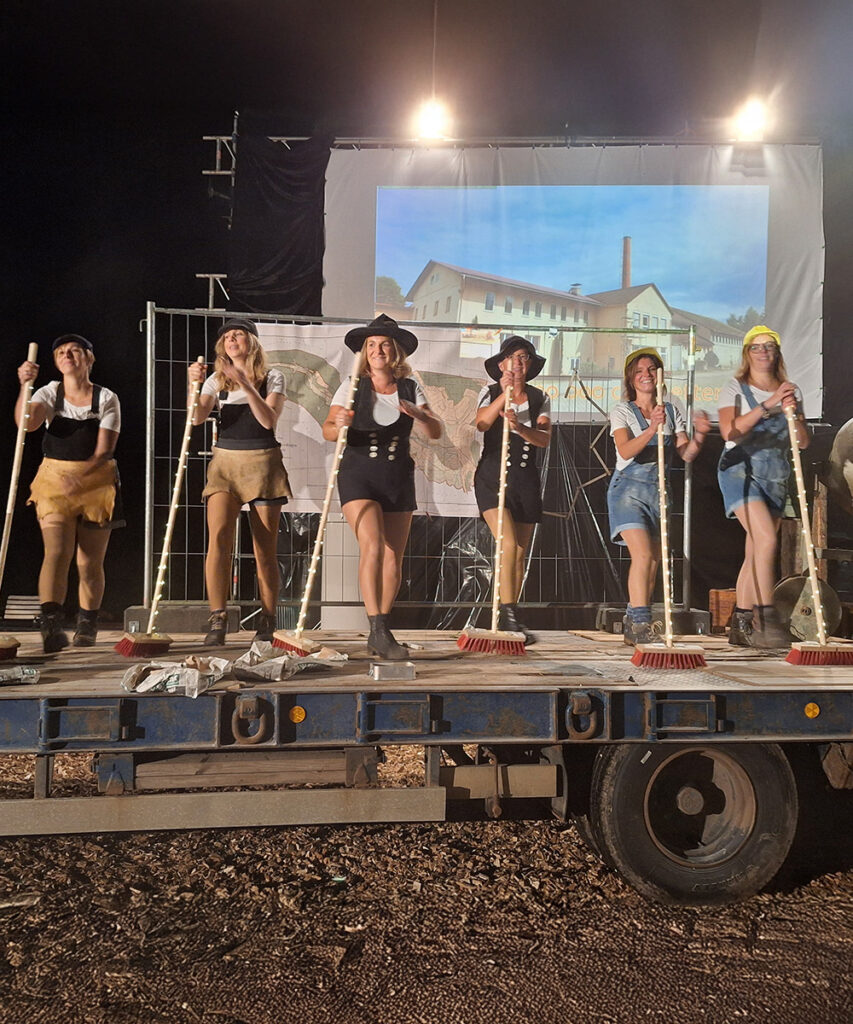 Die Tanzgruppe des Immerfroh erinnerte in einer gelungenen Darstellung an die vielen Frauen der Nachkriegszeit, die einen wesentlichen Anteil am Wiederaufbau Deutschlands hatten, auch in Wolterdingen. Sein Talent als Sänger und Schauspieler in einer Szene mit Stefan Zwick und Patrick Dagne zeigte uns der Schauspieler Nico König ebenso wie in der letzten Szene der Freilichtspiele: Zusammen mit Axel Ruf „philosophierten“ und klagten sie über den Untergang als Glasbläser. Dabei wollte Wolterdingen doch mit seiner eigenen Glasfabrik die Zukunft bestimmen.